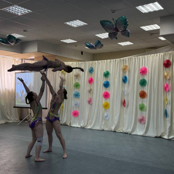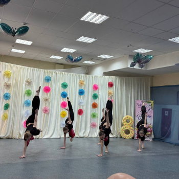 Открыл праздничную программу яркий номер коллектива черлидинга (рук. Невоструева А. Д.) — энергичные движения, помпоны и задор зарядили зал позитивом с первых минут. Далее выступил танцевальный коллектив «Перфоманс» (рук. Невоструева А. Д.) с композицией «Краса». Плавные, грациозные движения девушек подчеркнули красоту и изящество женского образа. Ярким моментом стало выступление Грибовой Аллы, обучающейся 27‑й группы, в составе студии спортивной акробатики «Эдельвейс». Зажигательный акробатический номер продемонстрировал силу, гибкость и мастерство девушек. Затем публику поразил акробатический коллектив «Платина» (рук. Невоструева А. Д.) своим патриотическим номером «Катюша». Сочетание классической мелодии и сложных акробатических элементов вызвало бурные овации. Обучающиеся 2-го курса подготовили особенный сюрприз — флешмоб, который объединил нежность и энергичность. Плавные движения сменялись динамическими элементами, создавая гармоничный образ весны.