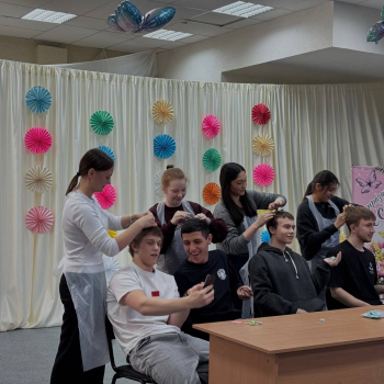 Девушки соревновались в том, кто за отведённое время завяжет больше резинок на волосах у юношей-добровольцев. Конкурс получился очень весёлым: участники смеялись, зрители подбадривали участниц, юноши старались не шевелиться, чтобы не усложнить задачу.