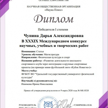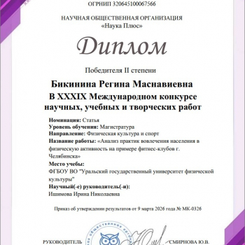 От всей души поздравляем магистрантов кафедры Менеджмента и цифровых технологий в спорте УралГУФК с победой в ХХХIХ Международном конкурсе научных, учебных и творческих работ от НОО «Наука Плюс»!