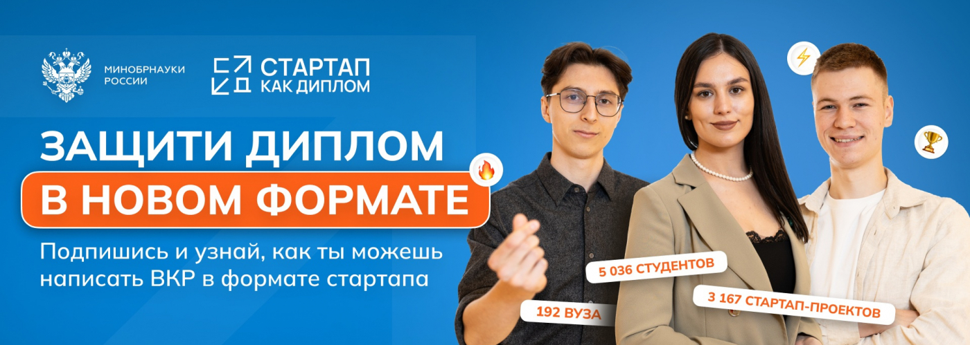 Всероссийский конкурс «Стартап как диплом» – конкурс выпускных квалификационных работ, которые представляют собой реальные бизнес-проекты, созданные одним студентом или командой, демонстрирующие уровень подготовки к самостоятельной профессиональной деятельности.