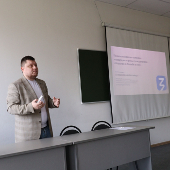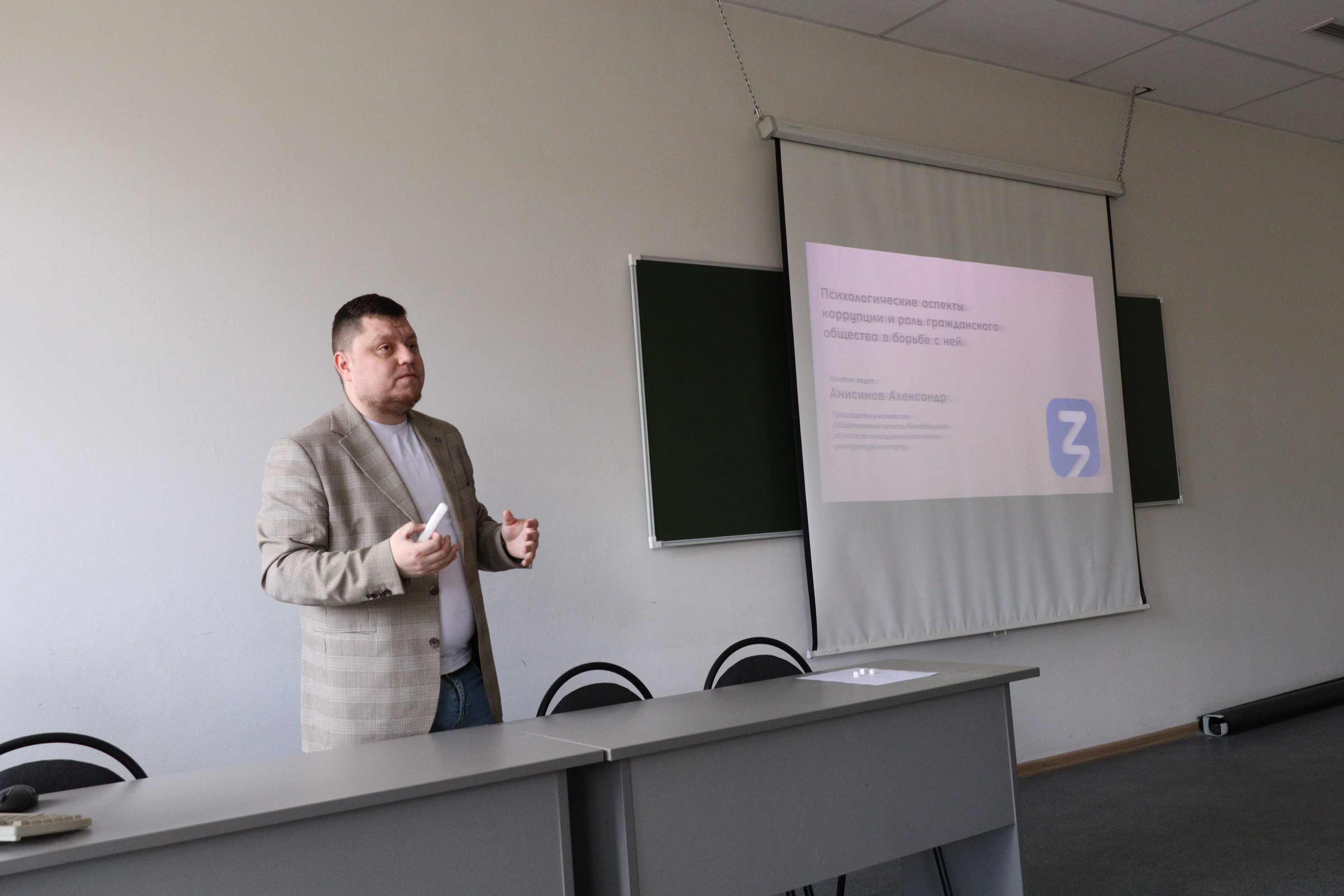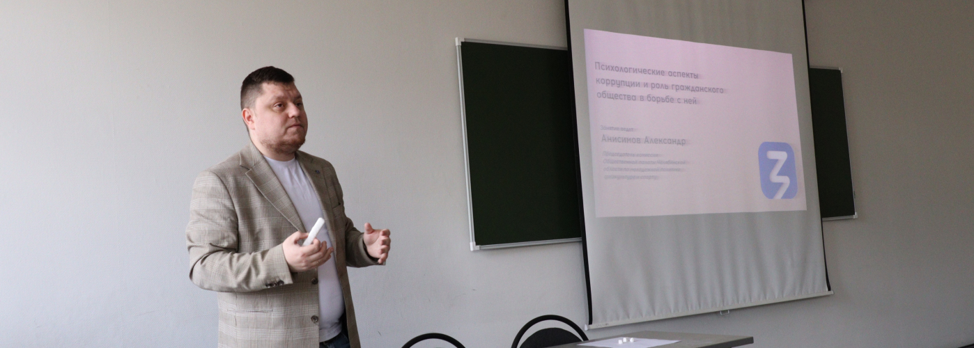 Тема выступления: «Психологические аспекты коррупции и роль гражданского общества в борьбе с ней». Лектор — Александр Александрович Анисимов, заместитель председателя комиссии Общественной палаты Челябинской области по молодежной политике, физической культуре и спорту, председатель Молодежного совета при Уполномоченном по правам человека в Челябинской области, председатель Совета общественных объединений Общественной молодежной палаты при Законодательном Собрании Челябинской области.